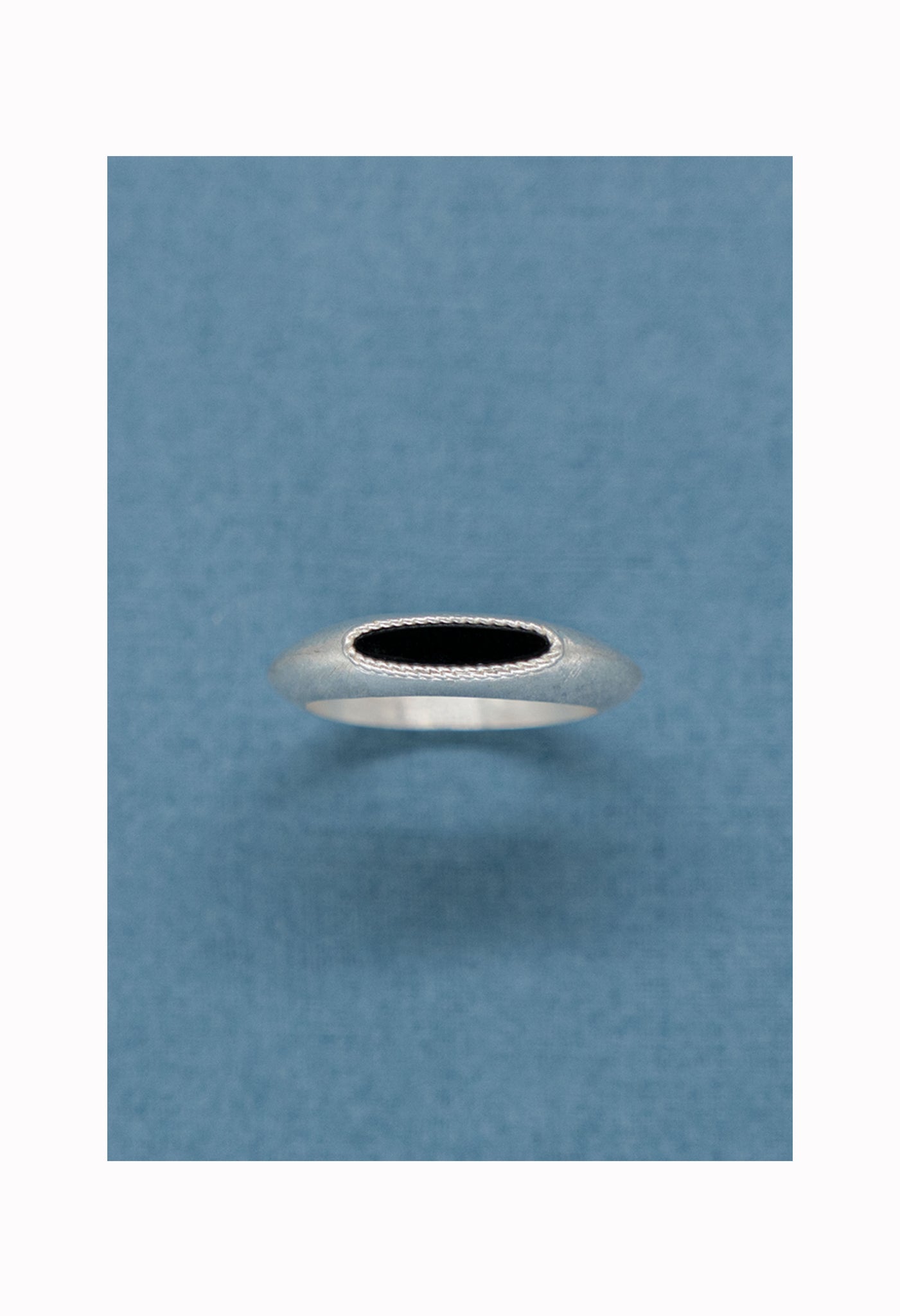 This ring features striking black agate as its centerpiece, richly textured and encircled by delicate silver filigree.